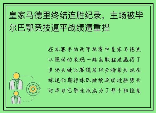 皇家马德里终结连胜纪录,主场被毕尔巴鄂竞技逼平战绩遭重挫