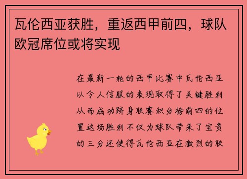 瓦伦西亚获胜,重返西甲前四,球队欧冠席位或将实现