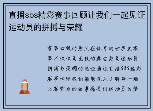 直播sbs精彩赛事回顾让我们一起见证运动员的拼搏与荣耀