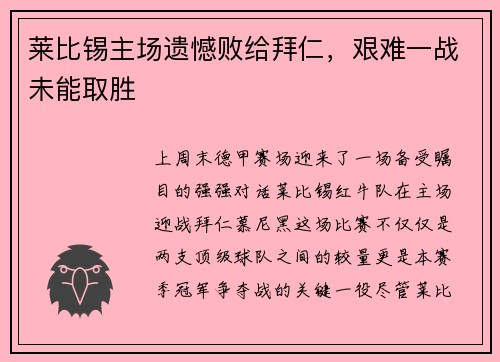 莱比锡主场遗憾败给拜仁,艰难一战未能取胜