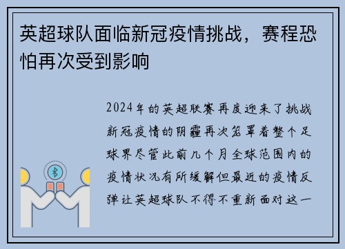 英超球队面临新冠疫情挑战,赛程恐怕再次受到影响